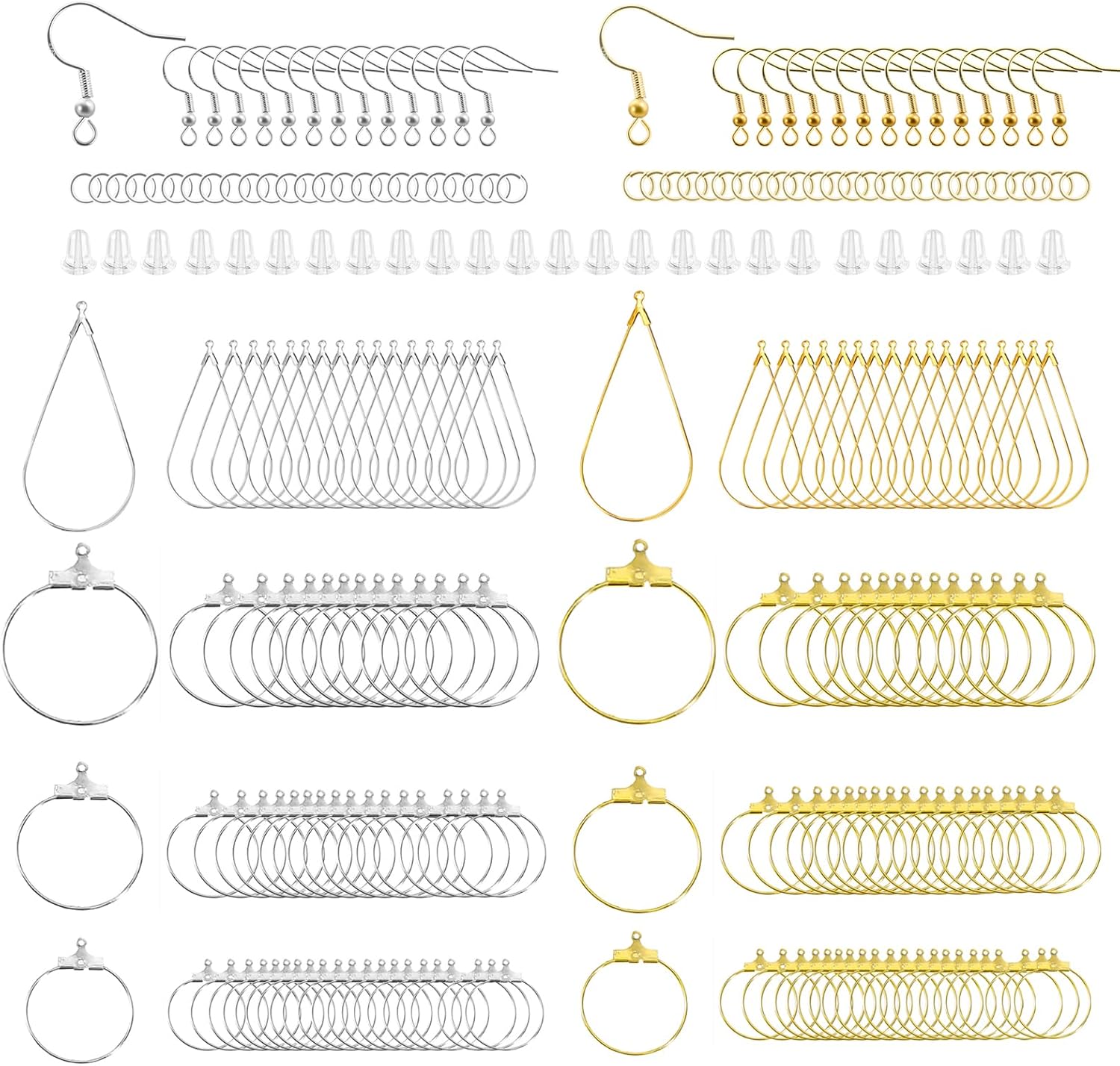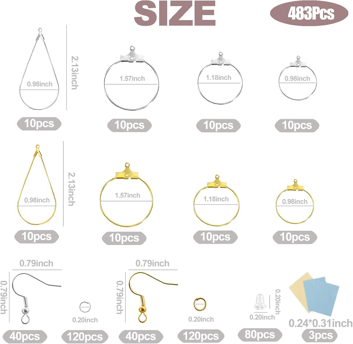 - Earring Making Supplies Component:The 483-piece earring making kit includes 80pcs hoop earrings, 80pcs hooks, 240pcs jump rings in gold and silver and 80pcs earring backs. Teardrop hoop earrings and round hoop earrings in 3 sizes are enough to meet your diverse production needs to match different occasions or dresses.3 cleaning cloths